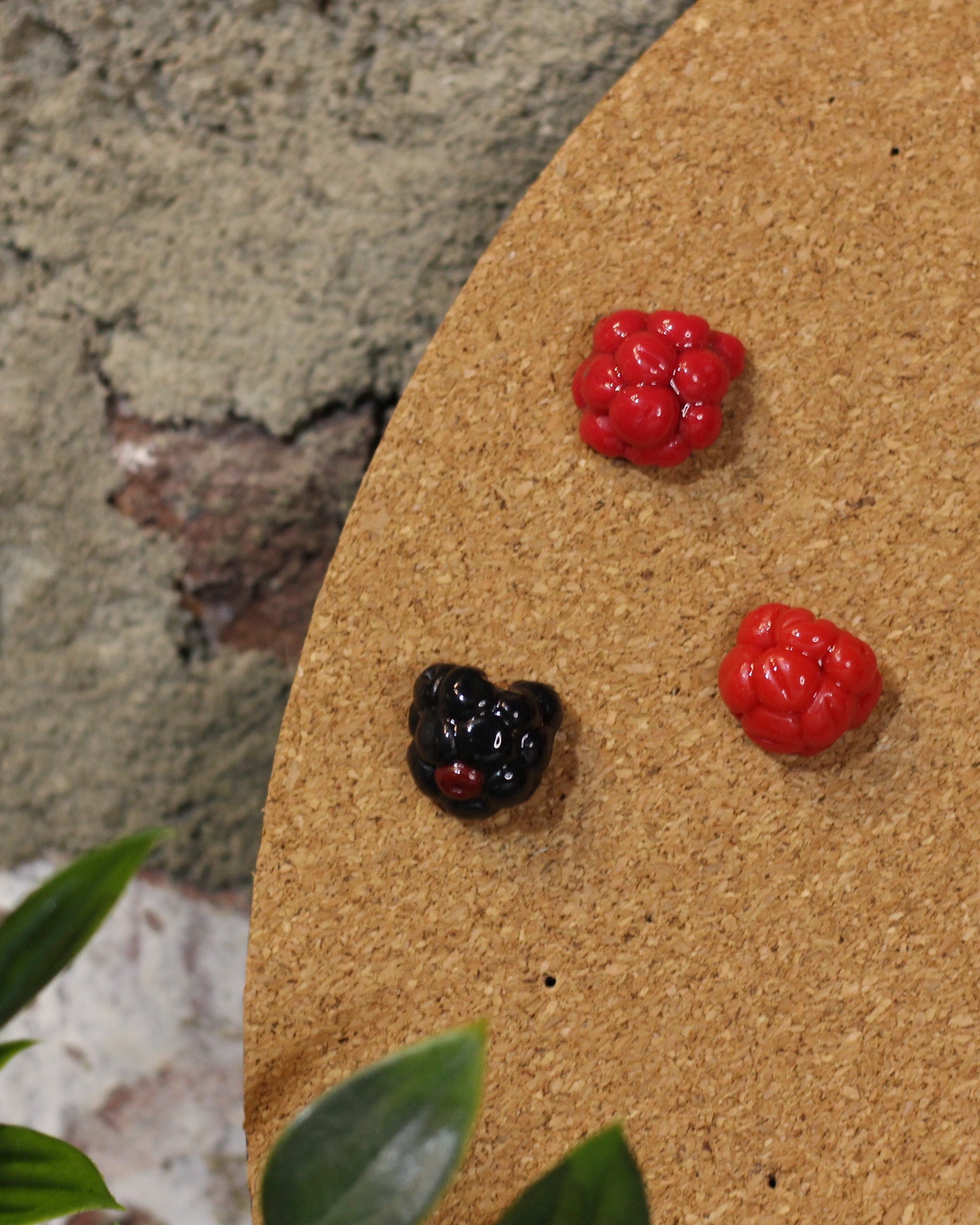 Handcrafted polymer clay raspberry and blackberry pins + magnets.